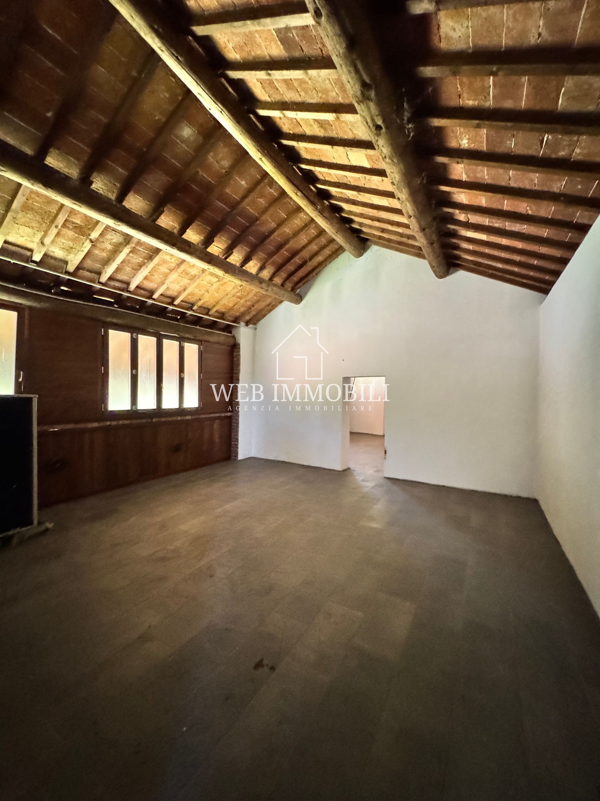 Il piano superiore, rustico ma luminoso, è pronto per essere trasformato: camere per un B&B, abitazione privata, laboratori o spazi per eventi.