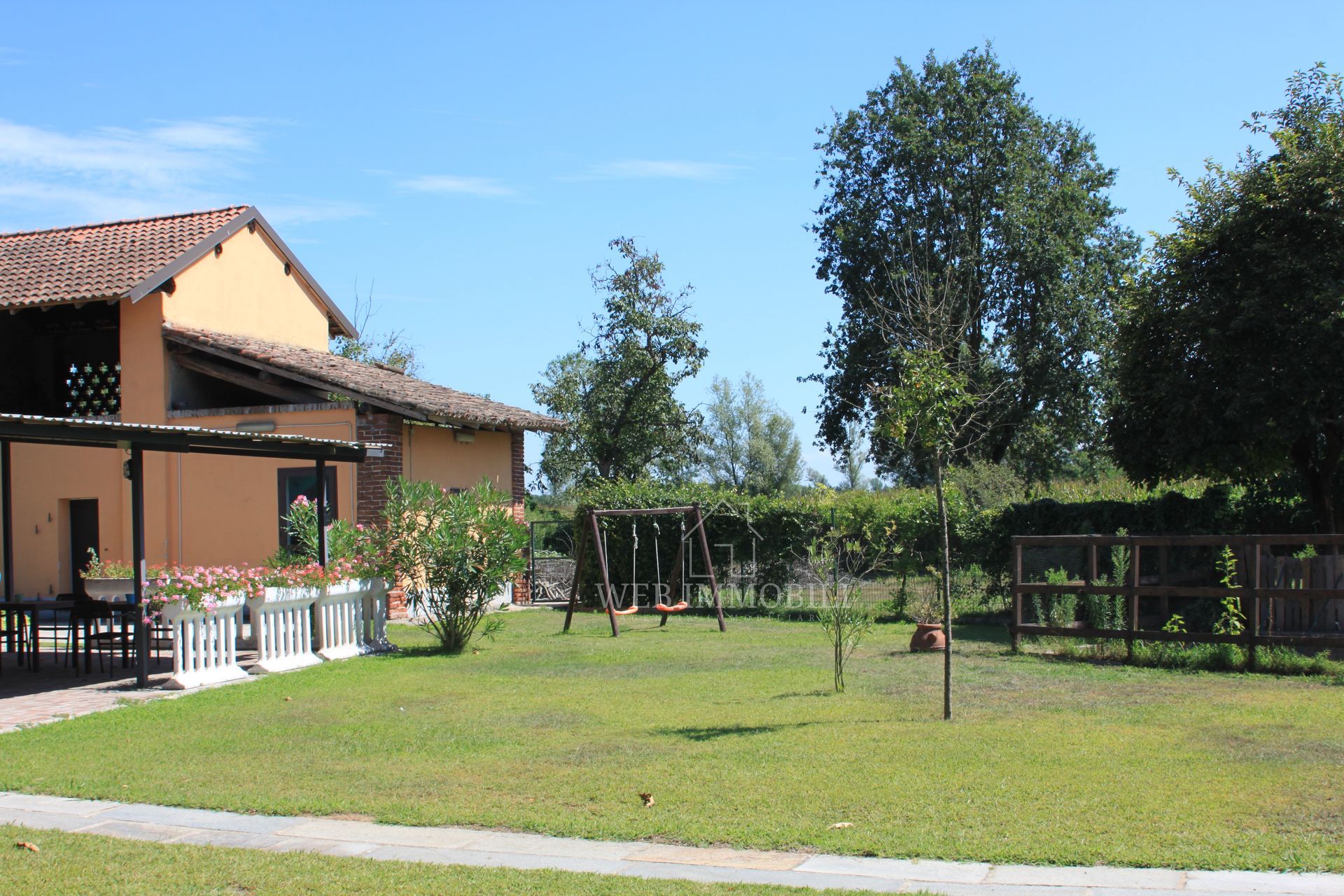 All’esterno, un giardino ampio e curato accoglie pergolati, vialetti in pietra e spazi pensati per pranzi all’aperto o eventi. Il terreno agricolo adiacente si presta a coltivazioni biologiche, orti didattici e piccoli allevamenti, offrendo una connessione concreta con la natura.